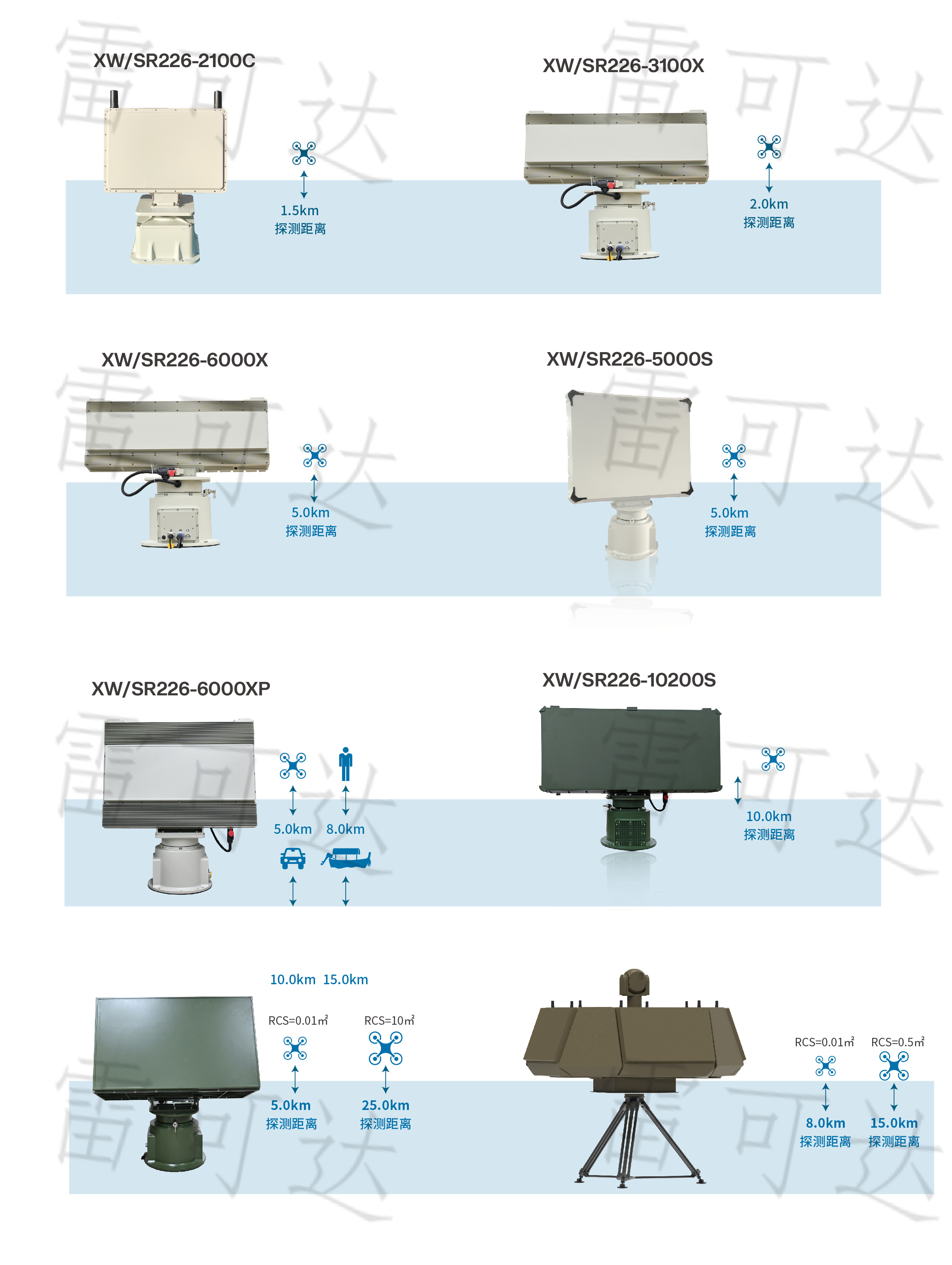雷达一般使用X波段、C波段、S波段等波段,采用脉冲多普勒体制、有源相控阵技术等,能在复杂环境下精确探测无人机等 “低慢小” 目标。量程距离可根据用户需求选择不同型号的雷达,例如雷可达的这几款雷达,量程可覆盖1.5-25.0km,适用于边境、机场、军事基地等重点区域内低空飞行的无人机、飞行器的探测、警戒和目标指示,还可实现高精度定位与全天候监测。